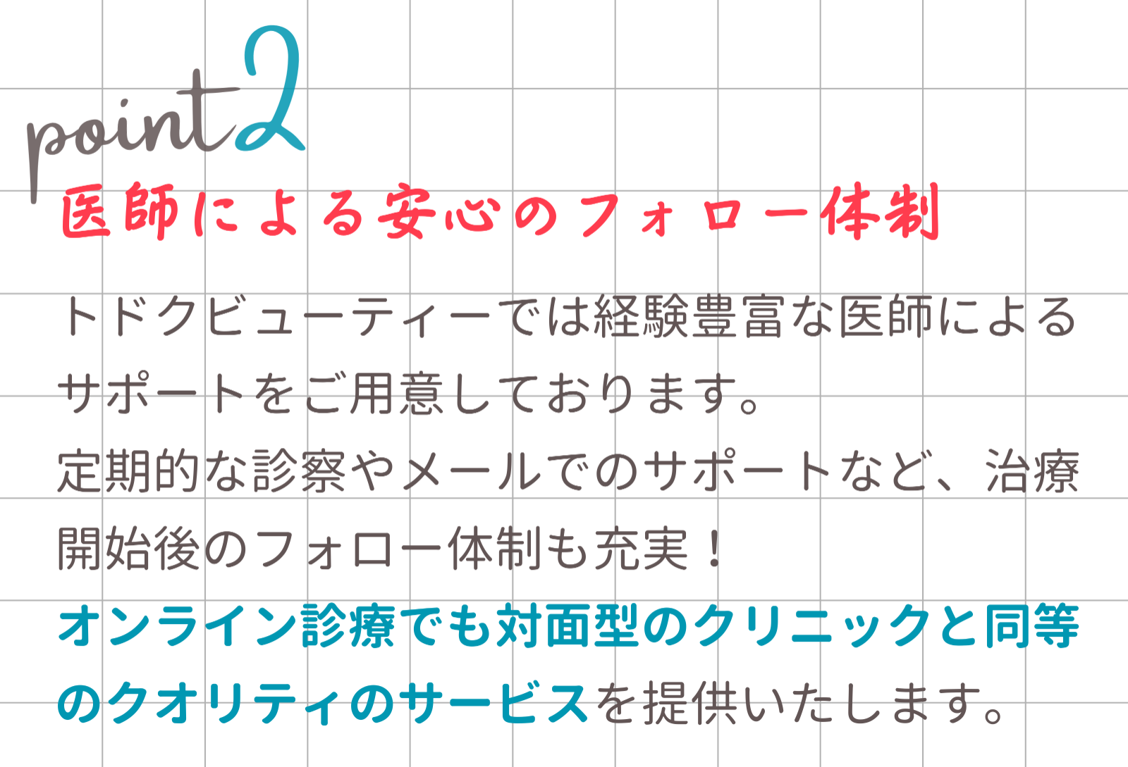トドクビューティーでは初回の診察で医師と相談しながら体質に合った処方を受けられます。効果はもちろん副作用などの不安な点もしっかりと医師からご説明させていただきます。